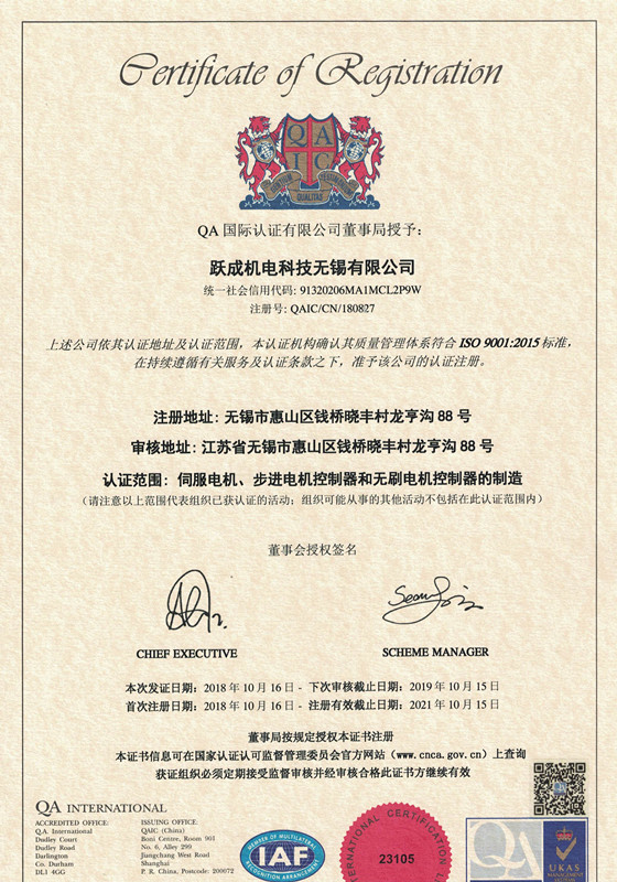 IS09001质量管理体系是与产品有关的管理活动。该标准规定了质量管理体系要求,在组织需要证实其提供满足顾客和适用法规要求的产品的能力时使用。香蕉视频污污机电无锡有限公司(跃成机电科技无锡有限公司)通过IS09001,专注制造、生产、销售香蕉视频在线观看视频,伺服驱动器等产品。
