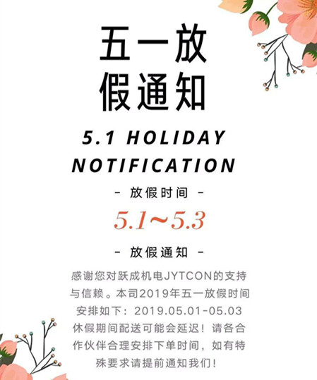 根据2019年国家法定假期的规定,并结合公司实际情况,香蕉视频污污(跃成机电)现对五一节放假做如下安排: